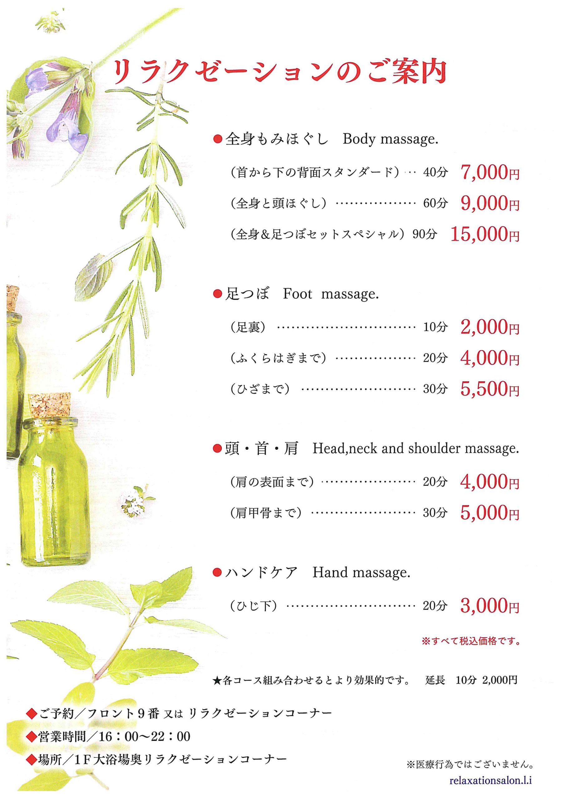 - [ご予約]当日のご予約はフロント9 番 または リラクゼーションコーナーで受け付けております ※前日までの事前予約は予約センターまで
