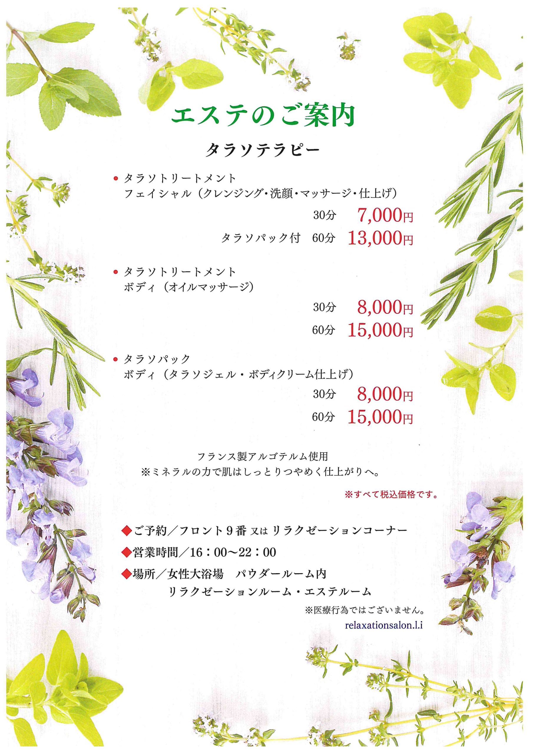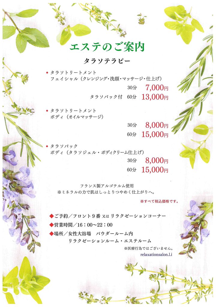 - 海藻(タラソ)パックは女性限定です。